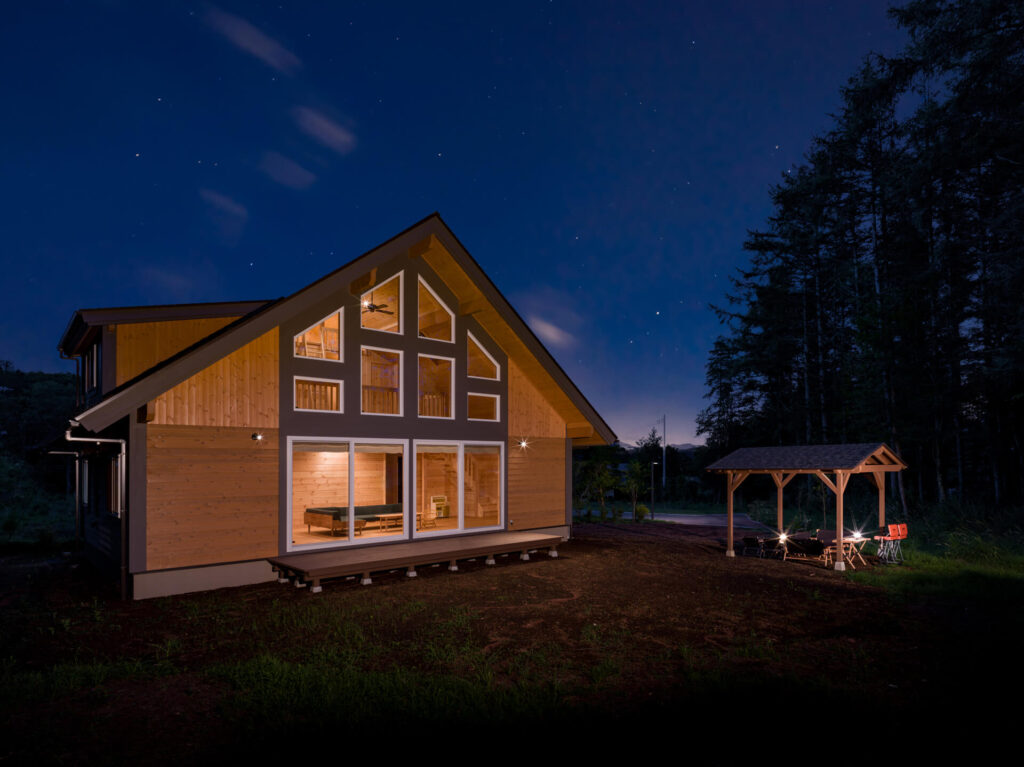 広いリビングや屋外スペースを活かし、BBQや語らいの時間を気兼ねなく楽しめるほか、サウナを備え、自然の中でリラックスする滞在にも対応しています